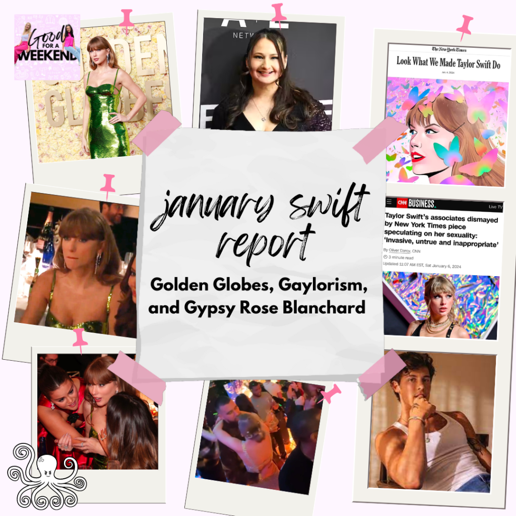 We discuss Taylor’s appearance at the 2024 Golden Globes, including the Jo Koy “joke” and her highly speculated conversation with Selena Gomez and Keleigh Teller. We also summarize the Gaylor New York Times piece and the response from Taylor’s camp, Gypsy Rose Blanchard’s release from prison and her love of Taylor, and Taylor’s relationship with Travis Kelce, of course.